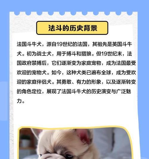 法国斗牛是一种非常有特色的犬种,它们极具灵活性和活力。由于其出众的表现,越来越多的人开始饲养法国斗牛。但是,如果你不了解如何正确地饲养和管理这些宠物,可能会导致它们身体上或者心理上的问题。本文为大家介绍法国斗牛的饲养管理方法,帮助你给你的爱宠提供最好的生活环境。
