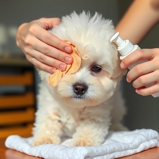 饭后给比熊擦脸擦嘴,每天用硼酸水+生理盐水以8:2的比例混合后,用棉片蘸取并清洁比熊犬的泪痕区域,再滴入适量闪晶(金银花洁眼液),有助于缓解眼部不适,减少泪液分泌。
