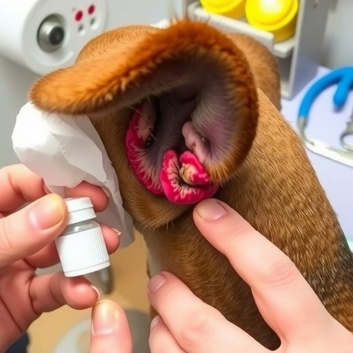 2.清洁后,用棉球蘸取适量的尔滴克(氟苯尼考甲硝唑滴耳液),均匀涂抹在外耳道上,每日1~2次。